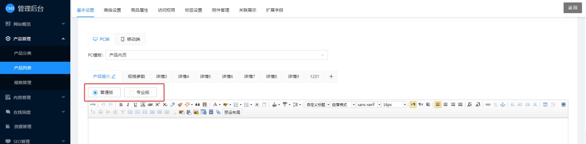 1,CMS后台产品/内容的详情编辑里,增加了普通版和专业版的选项,系统默认是普通版,用户可以选择切换到专业版。