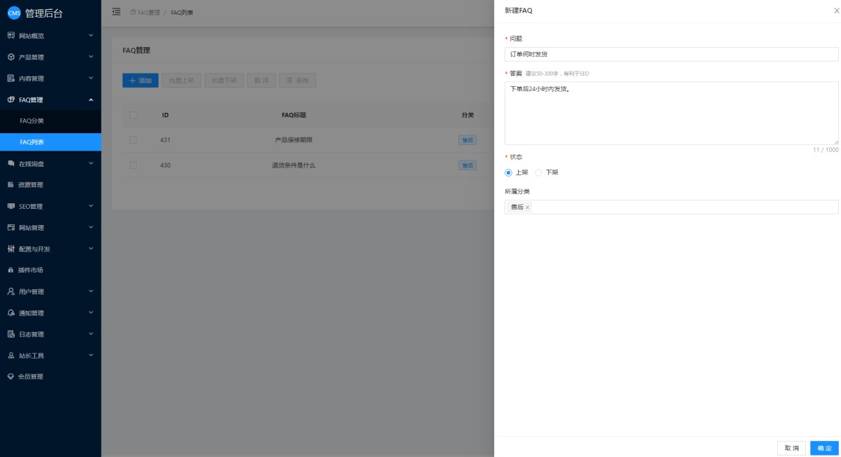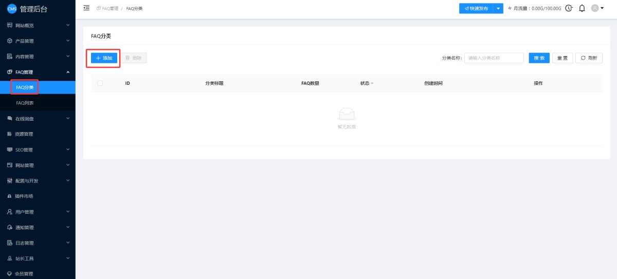 1,在CMS管理后台,新增FAQ管理。在FAQ分类里, 点击添加。FAQ分类主要用于设置多套FAQ使用。例如有的企业FAQ分为售前的,售中的,售后的,就可以通过分类来区分。或者不同的产品使用不同的FAQ,就可以设置多个分类。