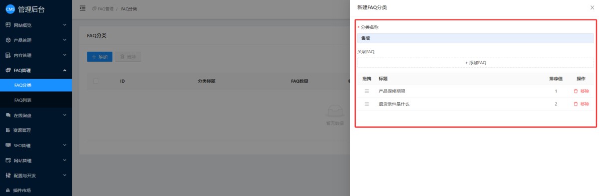 2,在分类编辑窗口,设分类名称。如果已经添加完FAQ了,可以直接关联FAQ,关联的FAQ可以拖拽调整排序,也可以从当前分类里移除。如果没有加FAQ,这里就只写分类名称即可。
