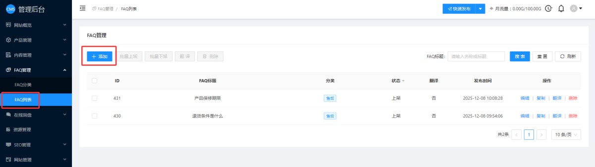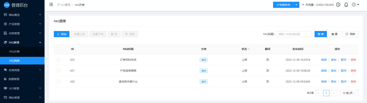 6,添加的FAQ会显示在FAQ列表里,后期可以修改或删除。