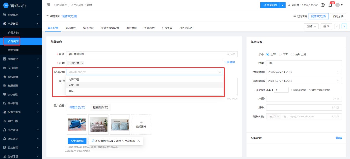 7,如果不同的产品需要使用不同的FAQ,添加完分类和FAQ列表后,在产品编辑页面,可以为当前产品选择对应的FAQ分类。
