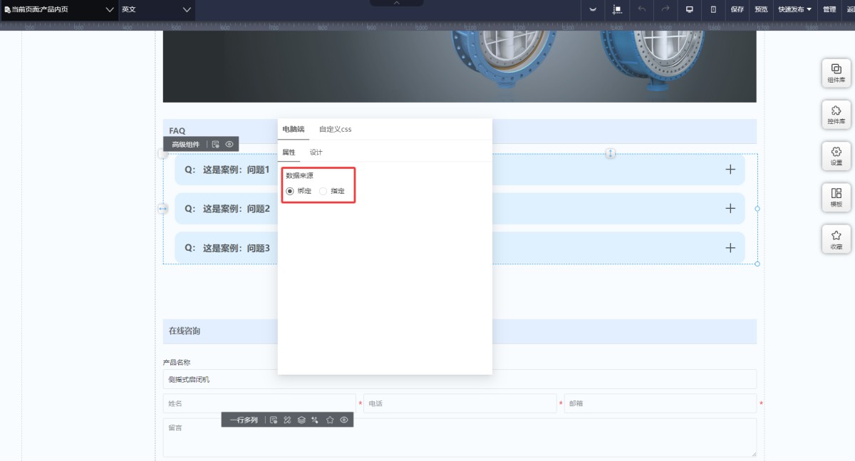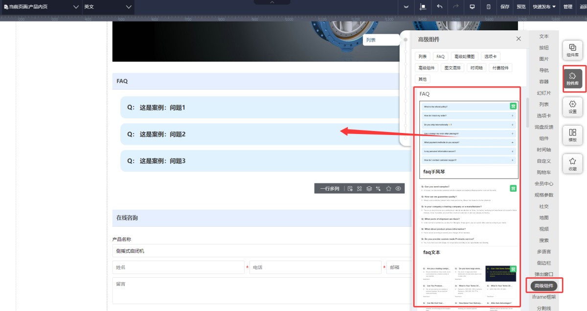 8,后台添加完FAQ后,在UI编辑页面,选择高级组件里的FAQ组件,添加到页面上。