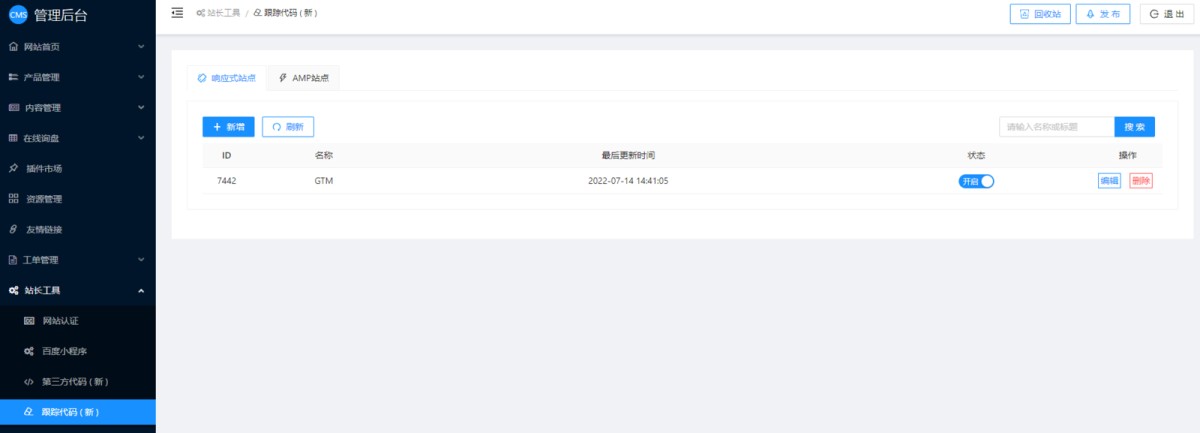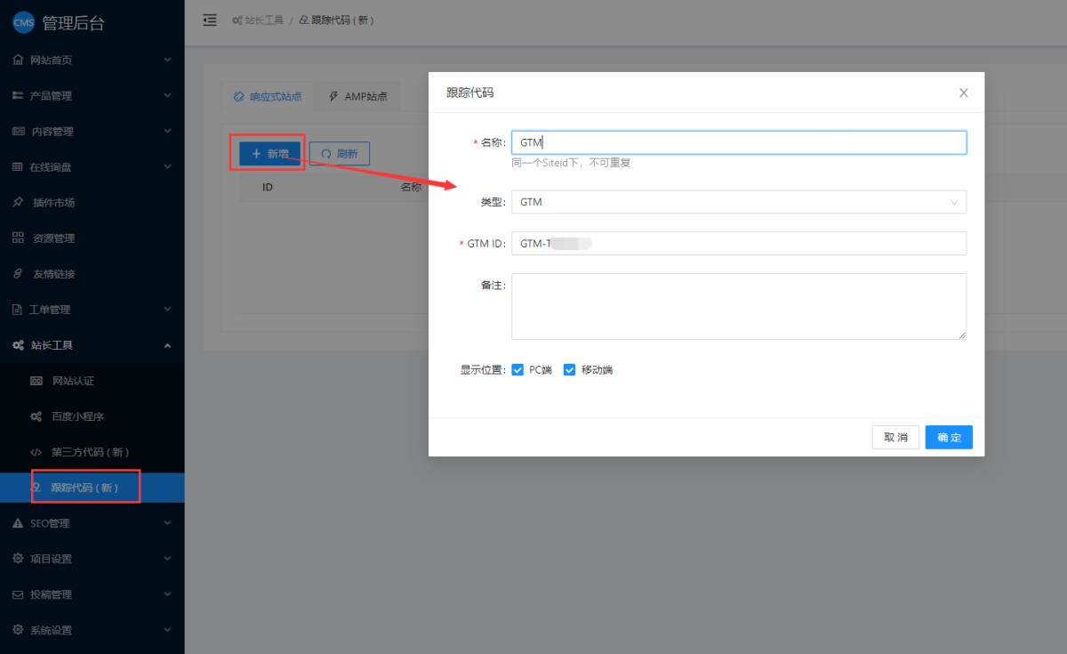 2,在网站CMS管理后台,站长工具-跟踪代码里,点击“新增”。在弹出窗口填写代码信息,然后保存即可。名称:GTM(该名称可自定义,不会在网站上显示,仅用于网站管理员在后台区分代码使用)。类型:选GTM。GTM ID:第一步获取的ID填上即可。