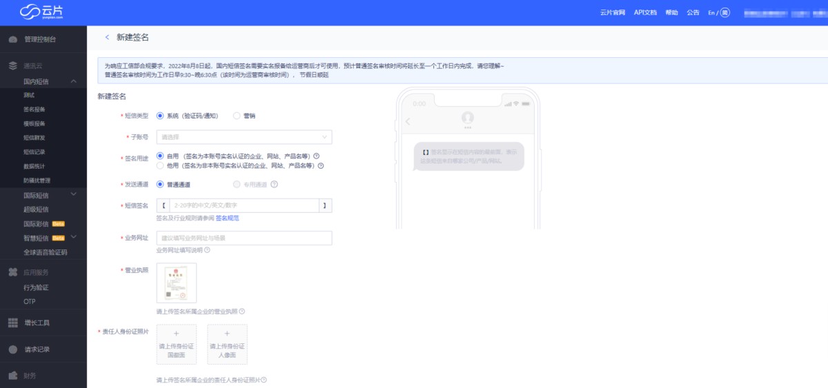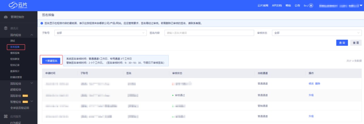 企业认证通过后,在左侧菜单国内短信里,点击签名报备-新建签名。