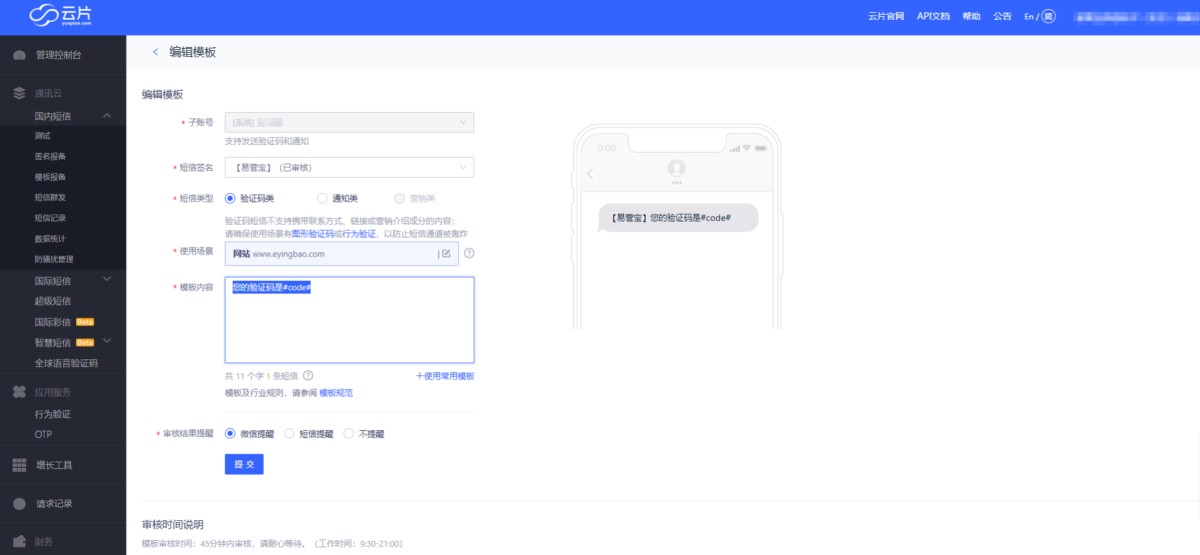 模版内容:您的验证码是#code#