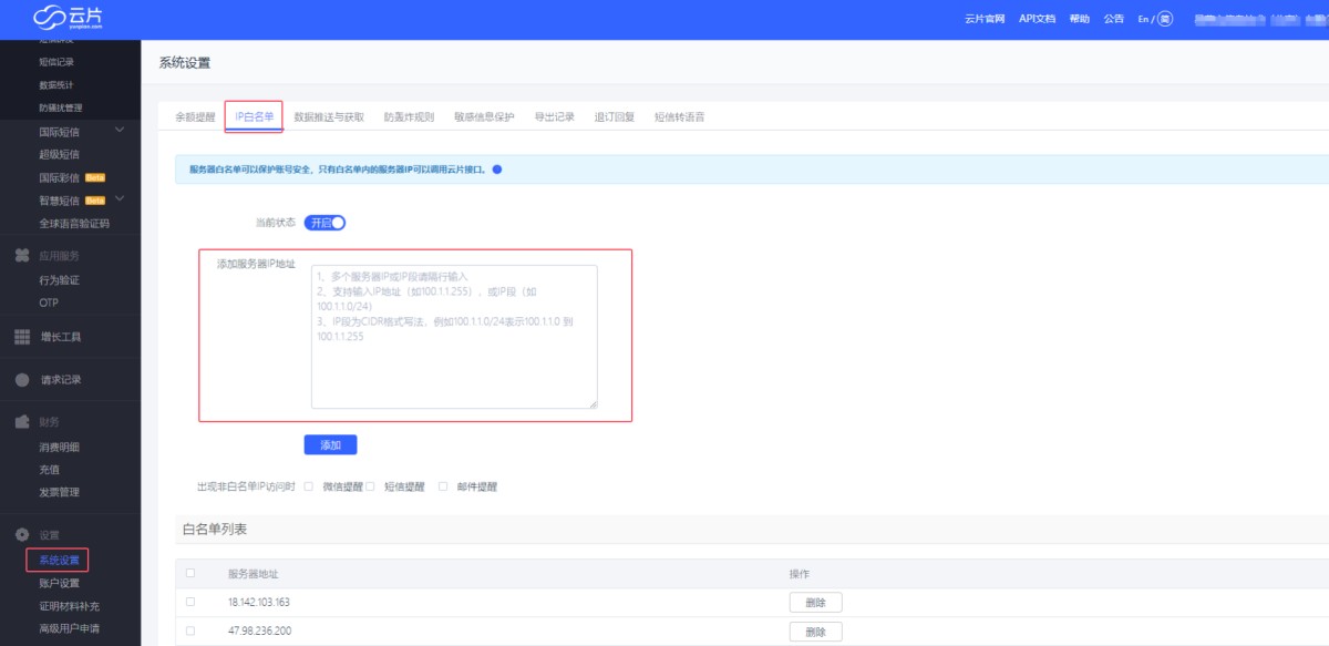 6,在系统设置-IP白名单里,添加IP地址:47.105.252.0