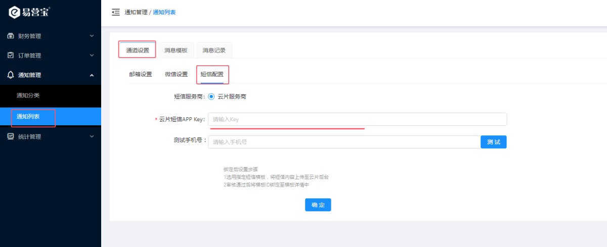 该功能需要OEM配置短信接口,易营宝平台目前使用的云片的短信推送系统,具体配置流程如下: