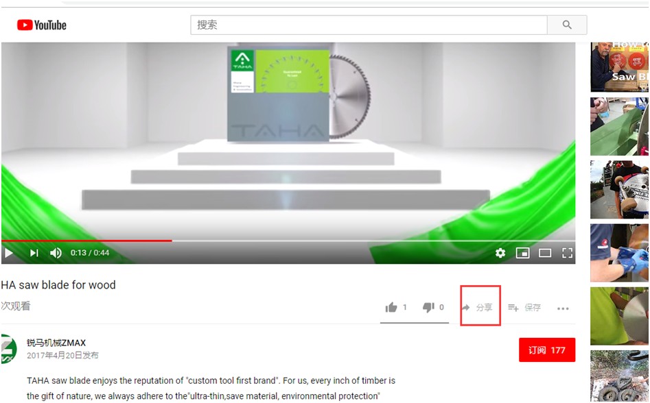 1,在YouTube上打开视频,视频下方的分享按钮