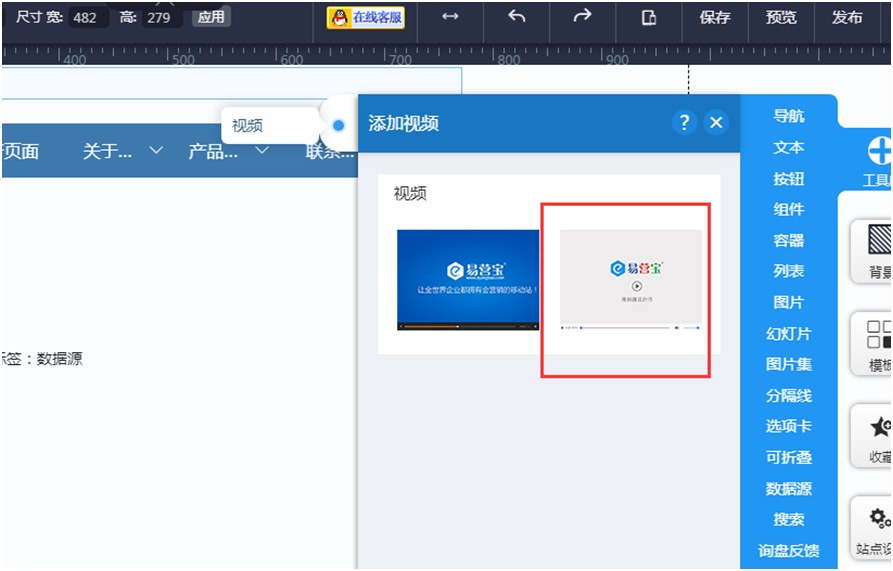 4,在易营宝的网站编辑页面,工具库里选择视频控件的第二个样式,拖入到页面的指定位置。