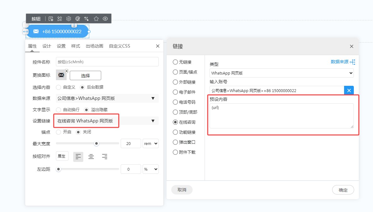 1,在为网站设置WhatsAp的链接时,如果想要带上当前页面的链接,可以在预设内容里添加网址的变量:大括号里添加url。