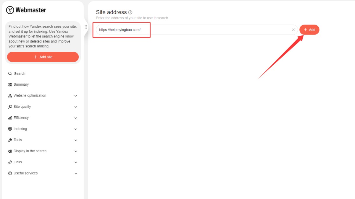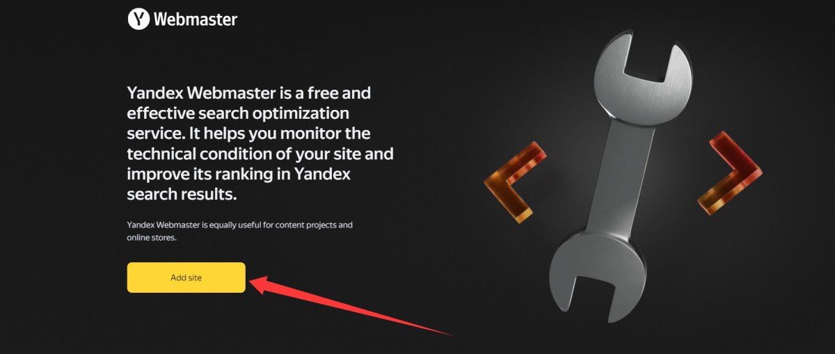 3,登录后,刷新或重新在首页点击Add site按钮,就可以进入Webmaster页面。添加网址。(如果不需要在Yandex Webmaster看数据,可以直接跳转到第9步,去网站后台进行绑定)