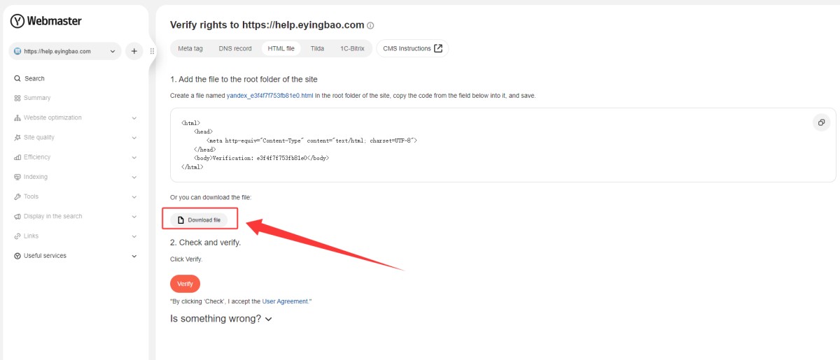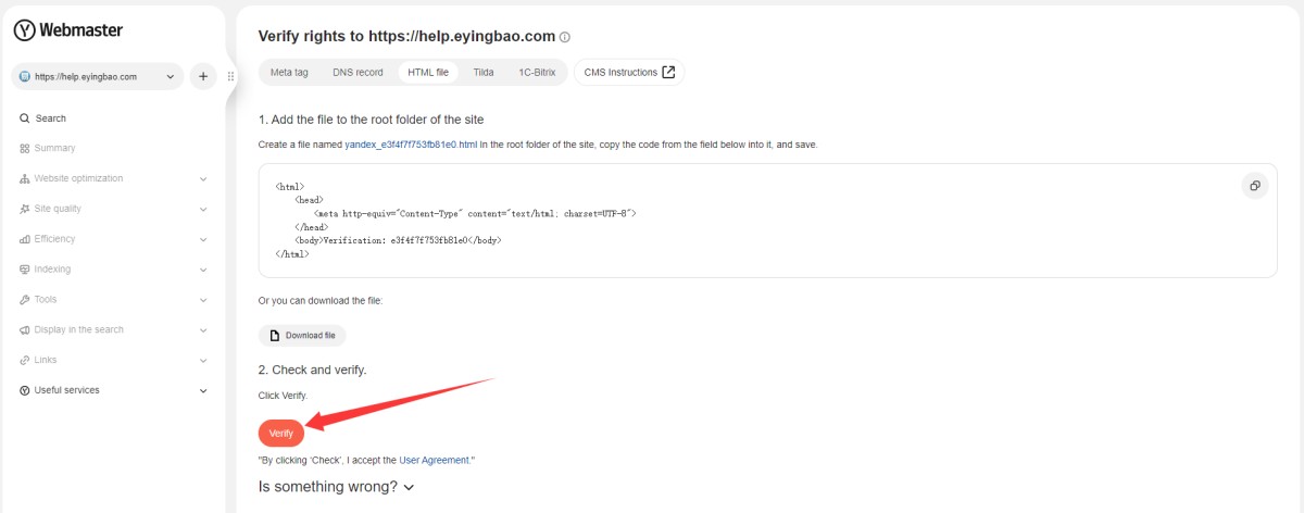 6,后台文件上传成功后,在Yandex Webmaster后台,点下验证。