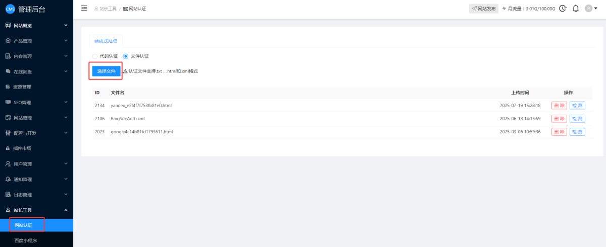 5,进入网站管理后台-站长工具-网站认证里,选择文件验证,将下载的验证文件上传到后台,上传后无需发布。点下检测,可以查看是否生效。