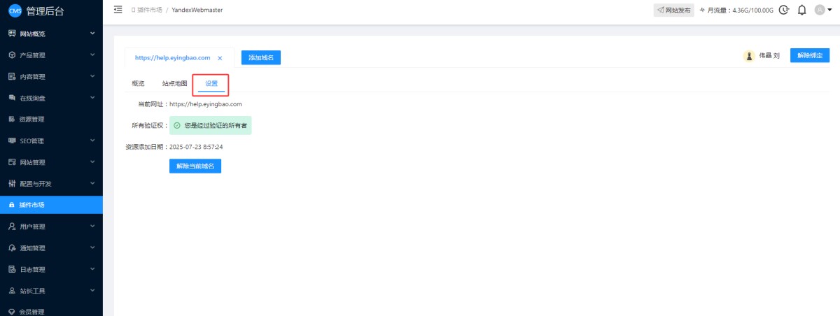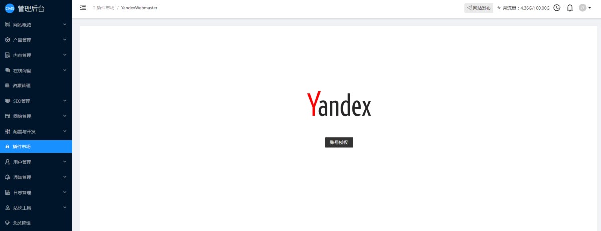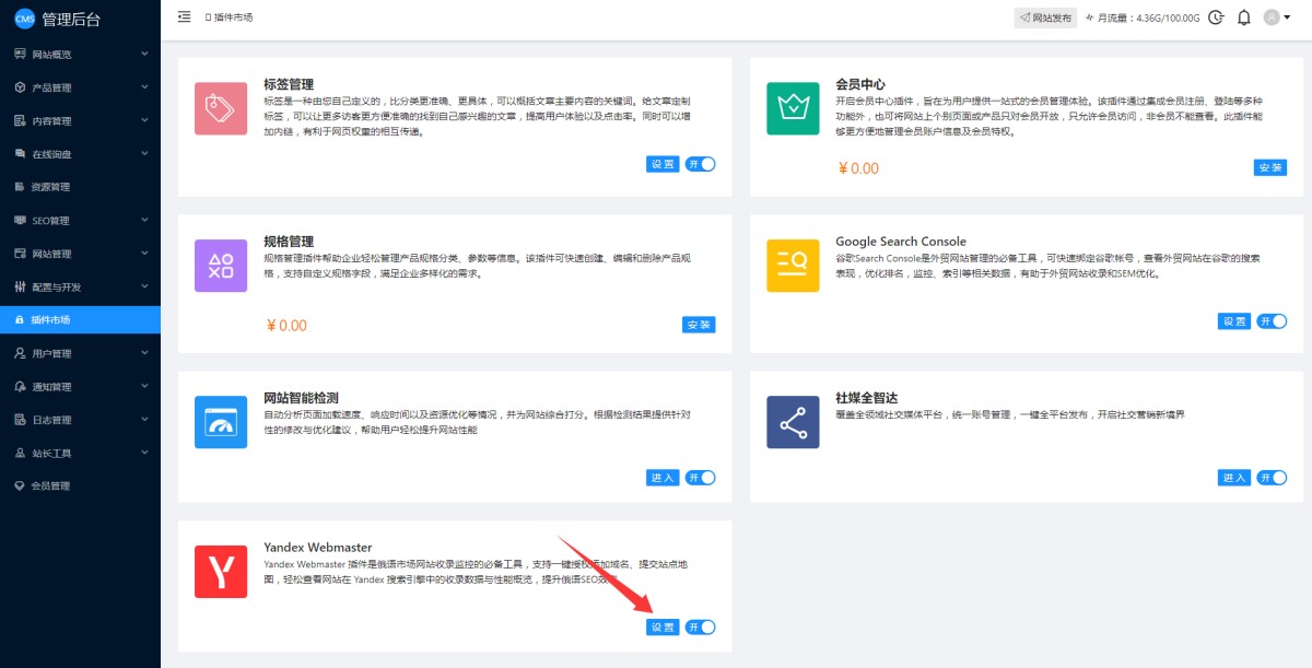 9,登录网站管理后台,在插件市场里,安装Yandex Webmaster插件,安装完成后点击设置。