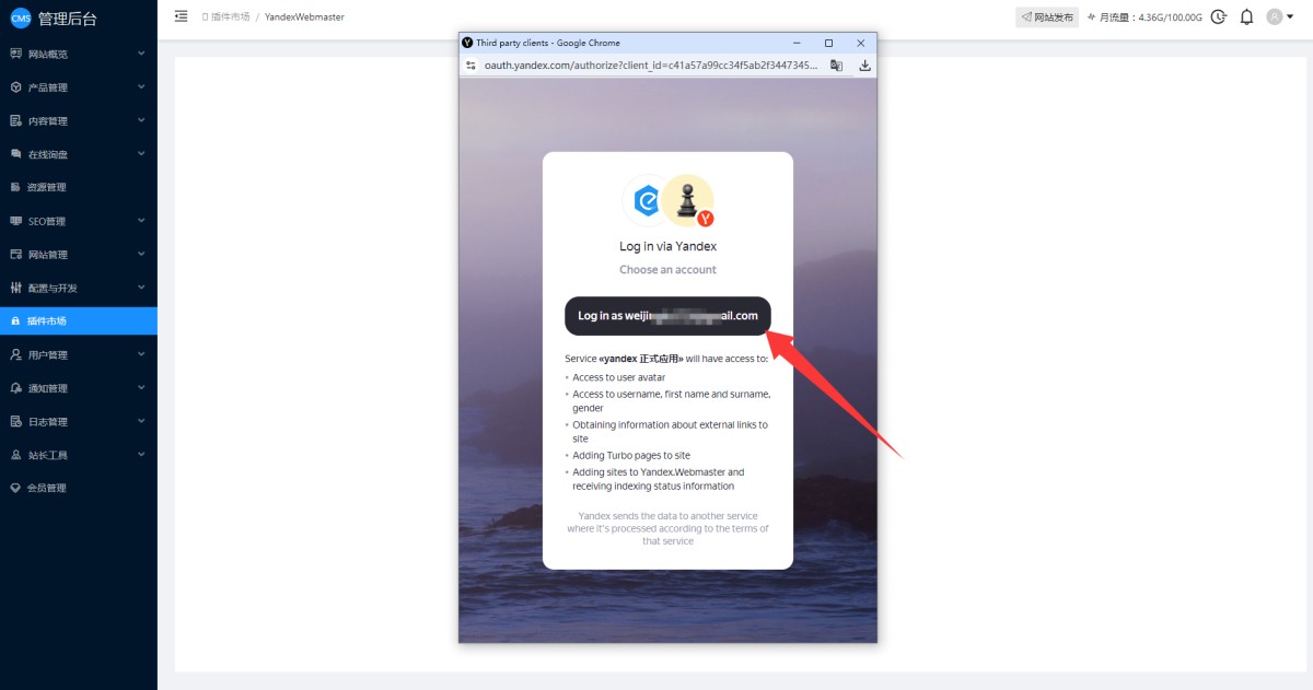 10,进入Yandex Webmaster后,点击账号授权。