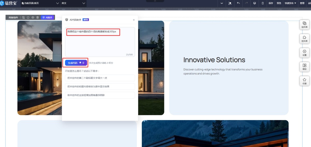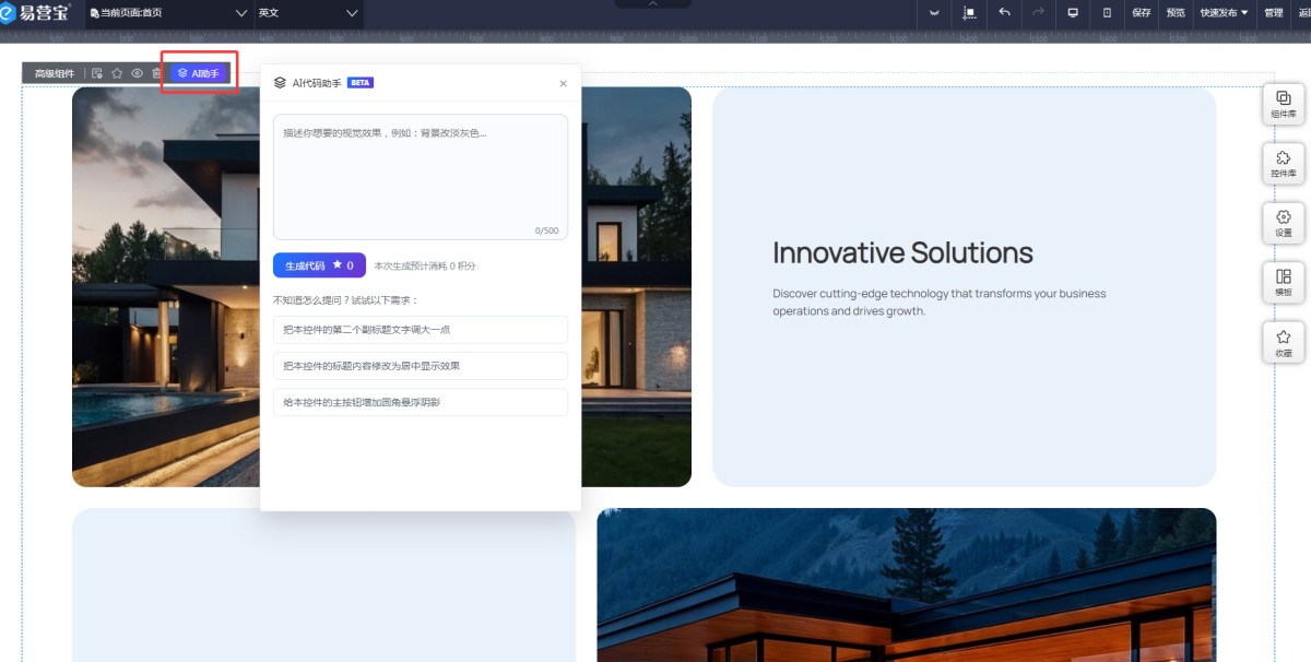 易营宝平台高级组件突破性接入AI智能CSS助手,彻底填平了“无代码建站”与“深度个性化设计”之间的鸿沟。用户无需再面对晦涩的代码编辑器,只需用白话描述想要的视觉效果,AI即可秒级生成专业级代码并精准生效,让不懂技术的运营者和设计师也能轻松突破样式限制,零门槛实现堪比定制开发的顶级视觉效果,真正实现“所想即所得”的高效建站体验。
