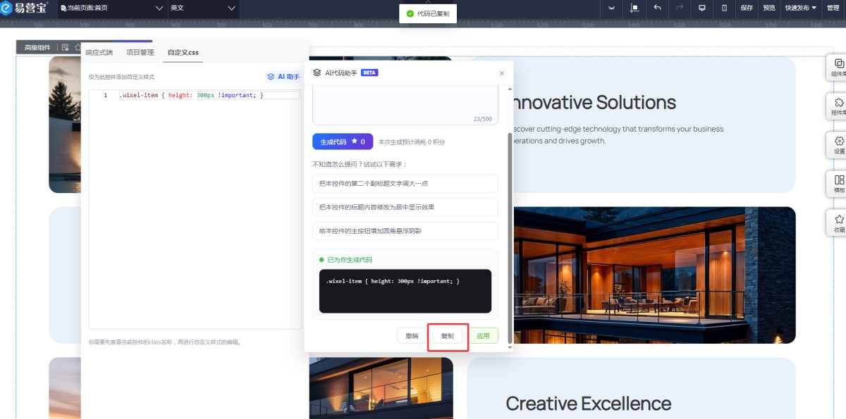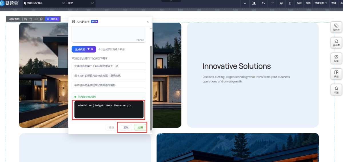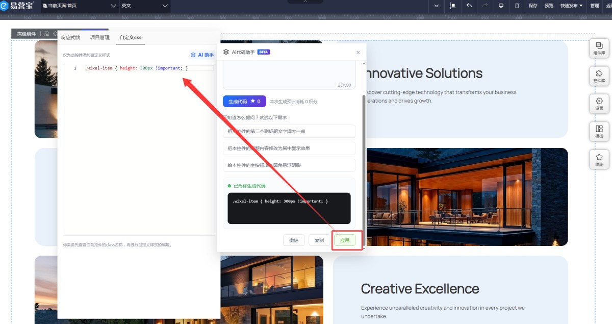 4,如果组件的CSS里之前没有加过自定义代码,可以直接点击“应用”。系统会把AI生成的代码直接添加到高级组件的CSS里。