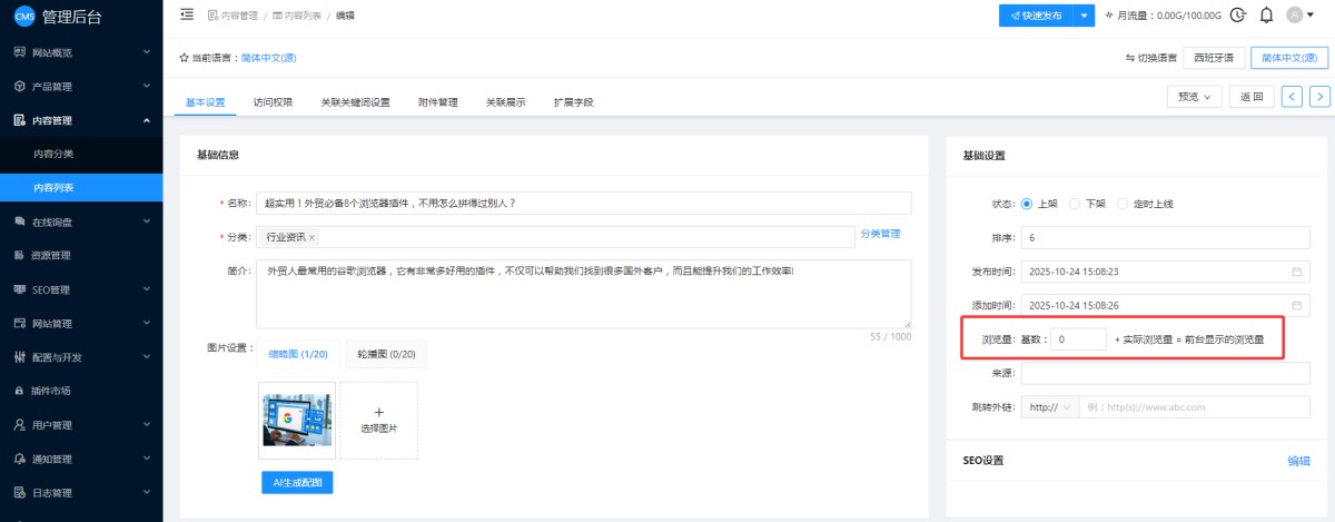 1,在CMS管理后台,新闻或产品的编辑页面,右侧有个浏览量设置,可以设置浏览量的基数。系统默认是0,即起始的浏览量显示为0,访客每次访问该新闻,浏览量都会加1。如果设置了基数,例如设置为100,那起始的浏览量就会显示为100,访客每次访问该新闻,浏览量都会在100的基础上加1。
