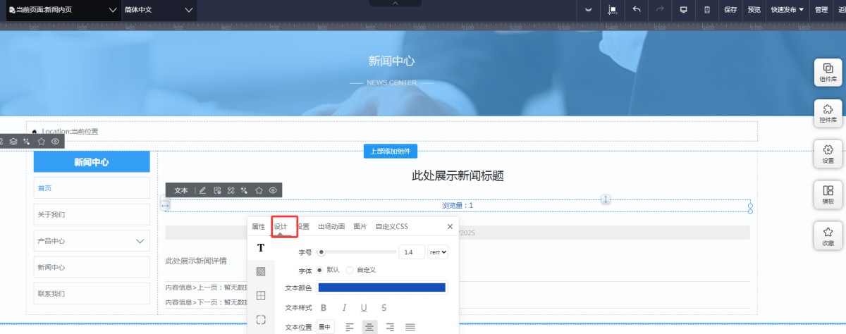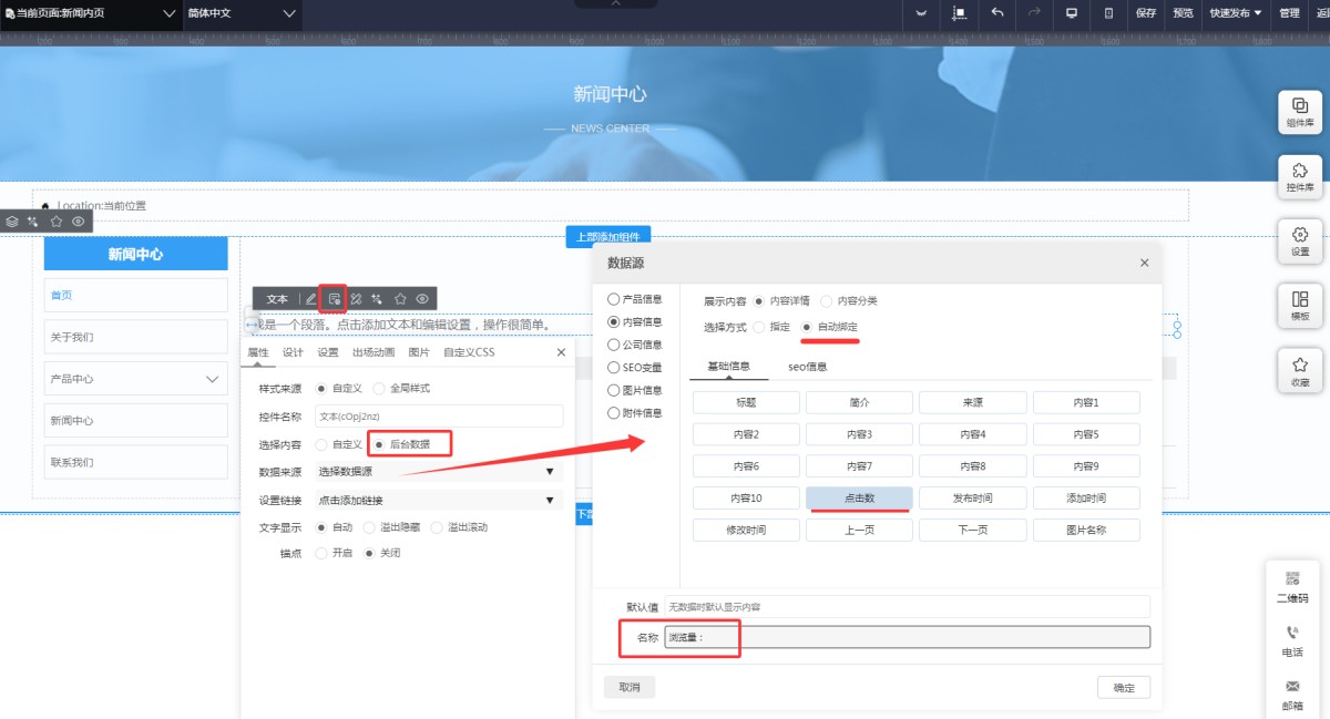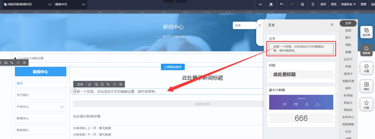 2,在UI编辑页面的新闻/产品内页里,拖入一个文本控件。
