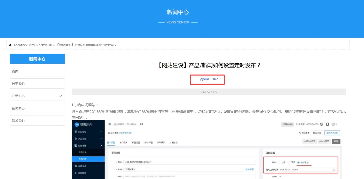5,设置完成后,访客在访问这个新闻/产品时,在详情页就会展示浏览量,并且会随访客访问量的增多,浏览量也会随之增加的。