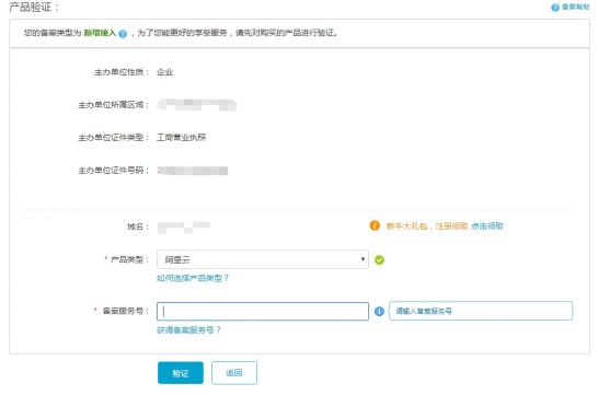7,在建站市场购买的商品,产品类型可选择“阿里云”,输入备案服务号