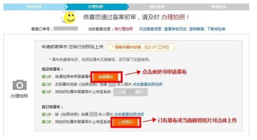 13,初审通过后,登陆备案系统申请幕布,收到幕布后自行拍照并上传照片审核(拍照前请先查看拍照说明,并避免身着红色或蓝色上衣进行拍照)