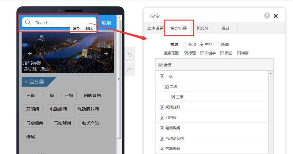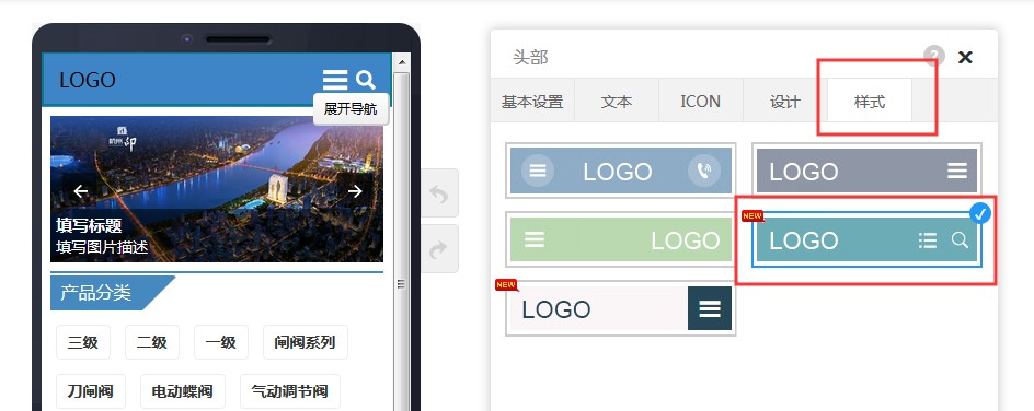 1,在头部属性-样式里选择第四个样式,带搜索图标的。