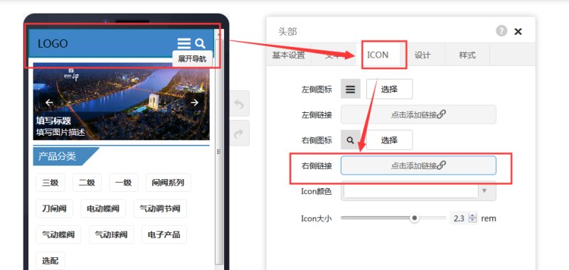 6,在头部属性-ICON里,设置右侧链接。