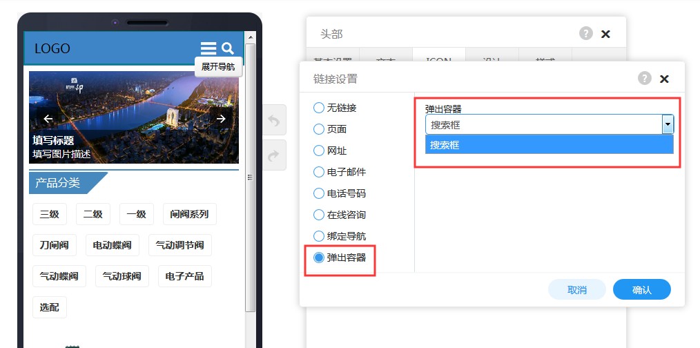 7,连接设置里,选择弹出容器,选择刚刚设置的搜索框即可。
