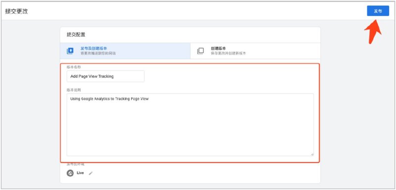 点击提交(Submit),填写相应的版本名称和说明,点击发布(Publish),此时可以重新刷新你的页面,并且到Google Analytics查看相应的数据。