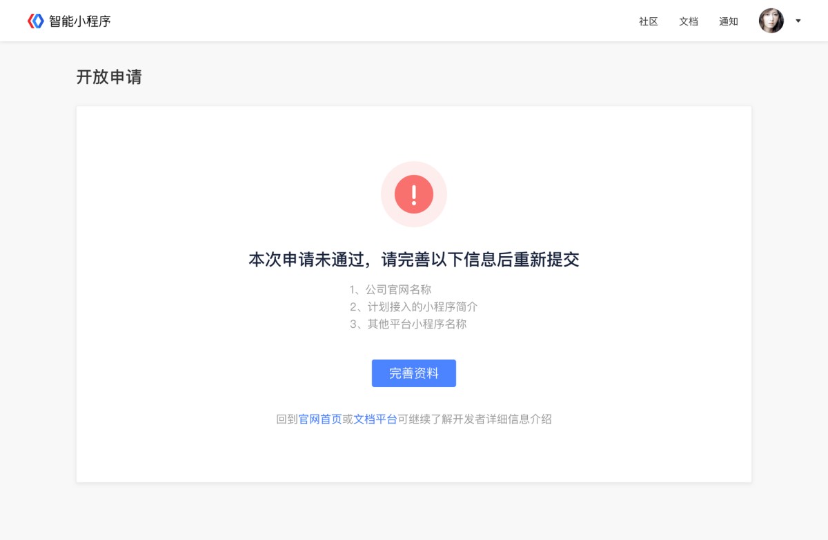 ④ 申请被驳回:信息不完整,可再次完善资料后进行提交。