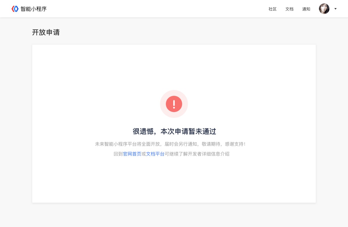 ⑤ 申请被拒绝:暂时不符合申请条件,无法再次提交,可等待正式开放后注册。