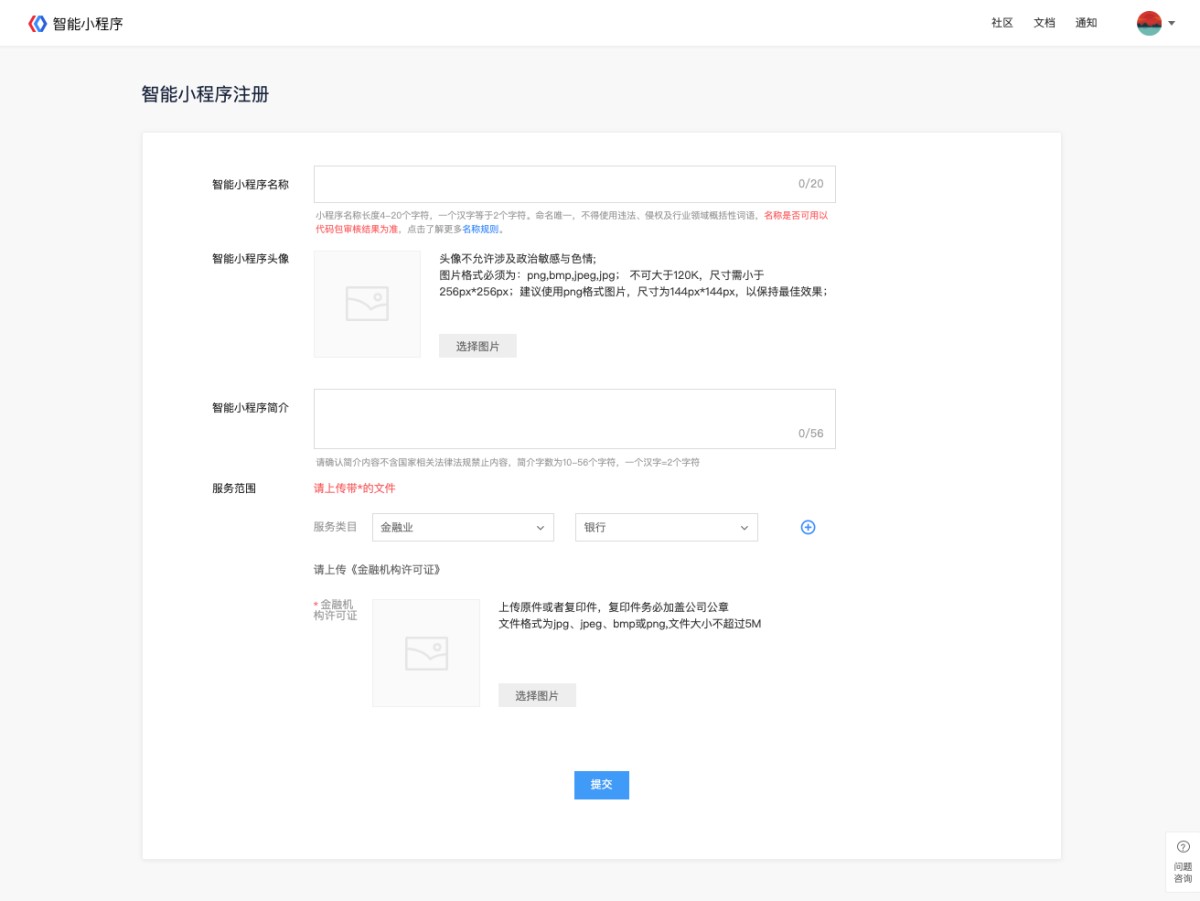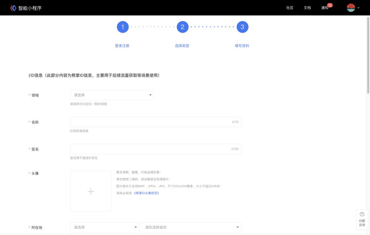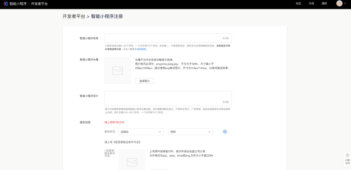 ② 完善小程序信息:填写智能小程序名称、简介、上传头像并选择服务范围。如果选择为特殊行业,还需根据界面提示提交相应资质材料。