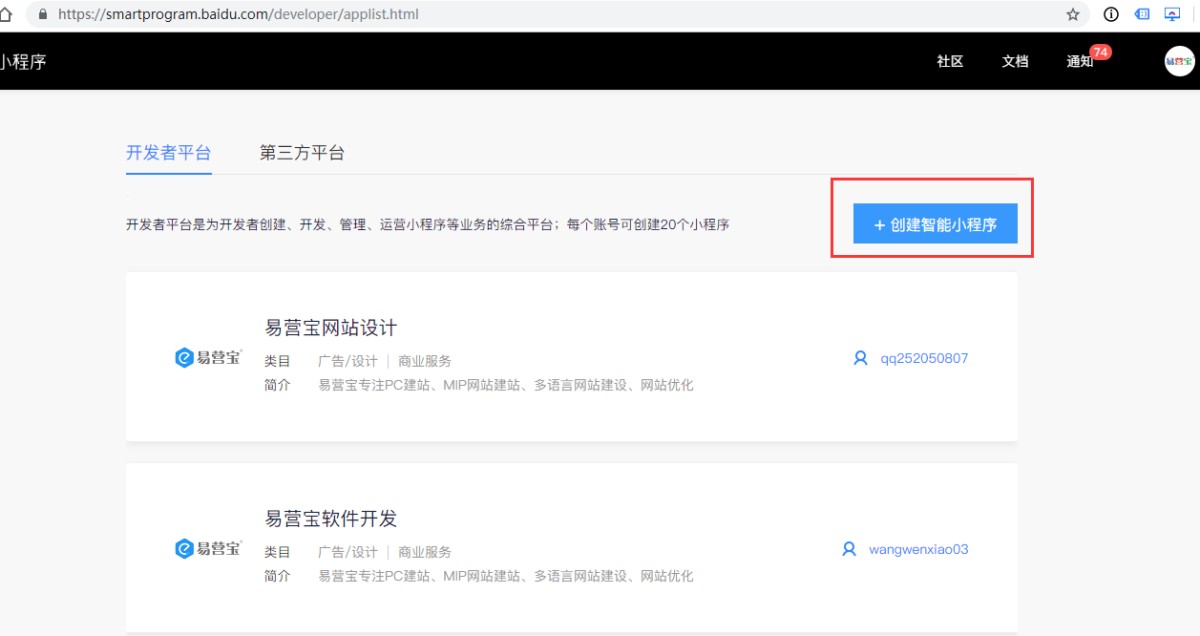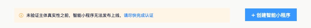 ① 创建小程序:主体认证审核通过后,在小程序管理中心页面,点击“创建智能小程序”