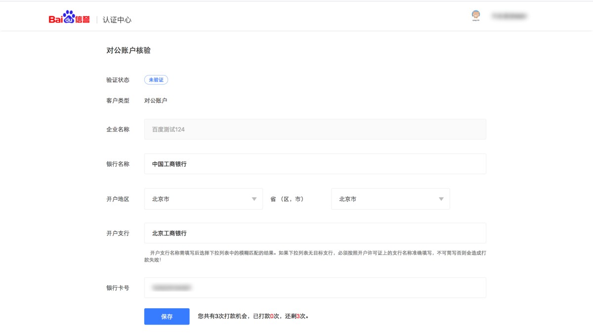 ② 对公打款:填写企业对公银行开户信息。注:此验证是百度给企业打款