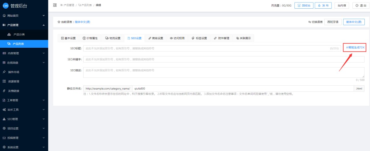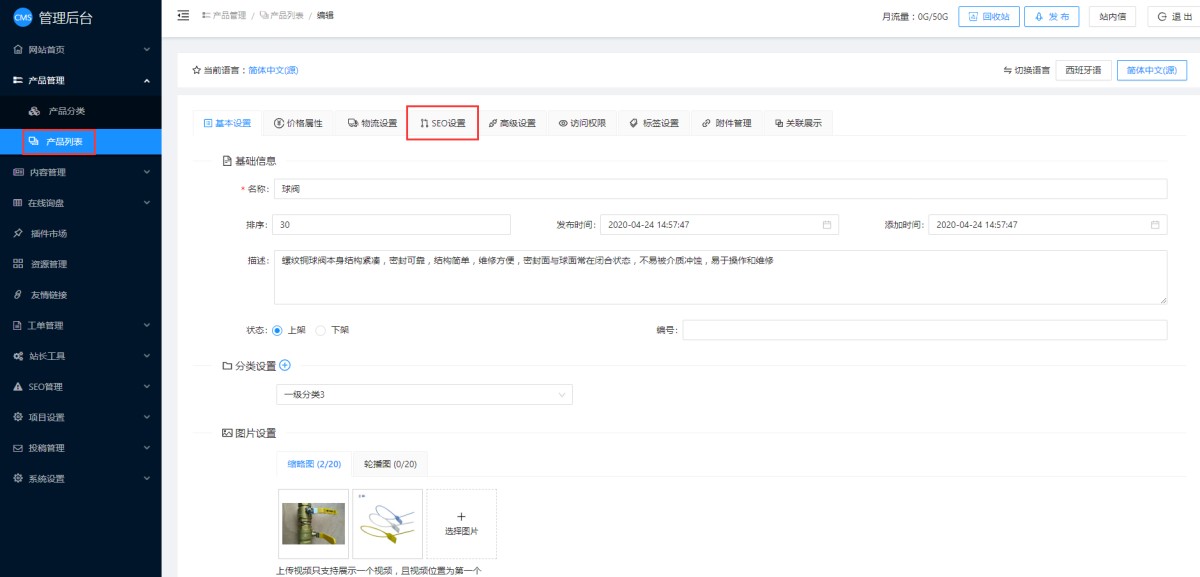1,在CMS管理后台,产品管理或内容管理里,进入产品或内容的编辑页面,点击SEO设置。
