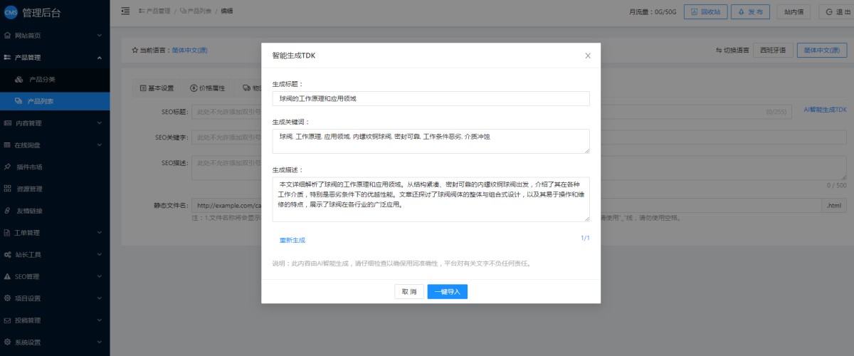 3,AI会根据详情里的文本内容生成标题、关键词和描述。管理员页也可对生成的内容进行二次修改。确认使用后,点击“一键导入”,然后保存即可。