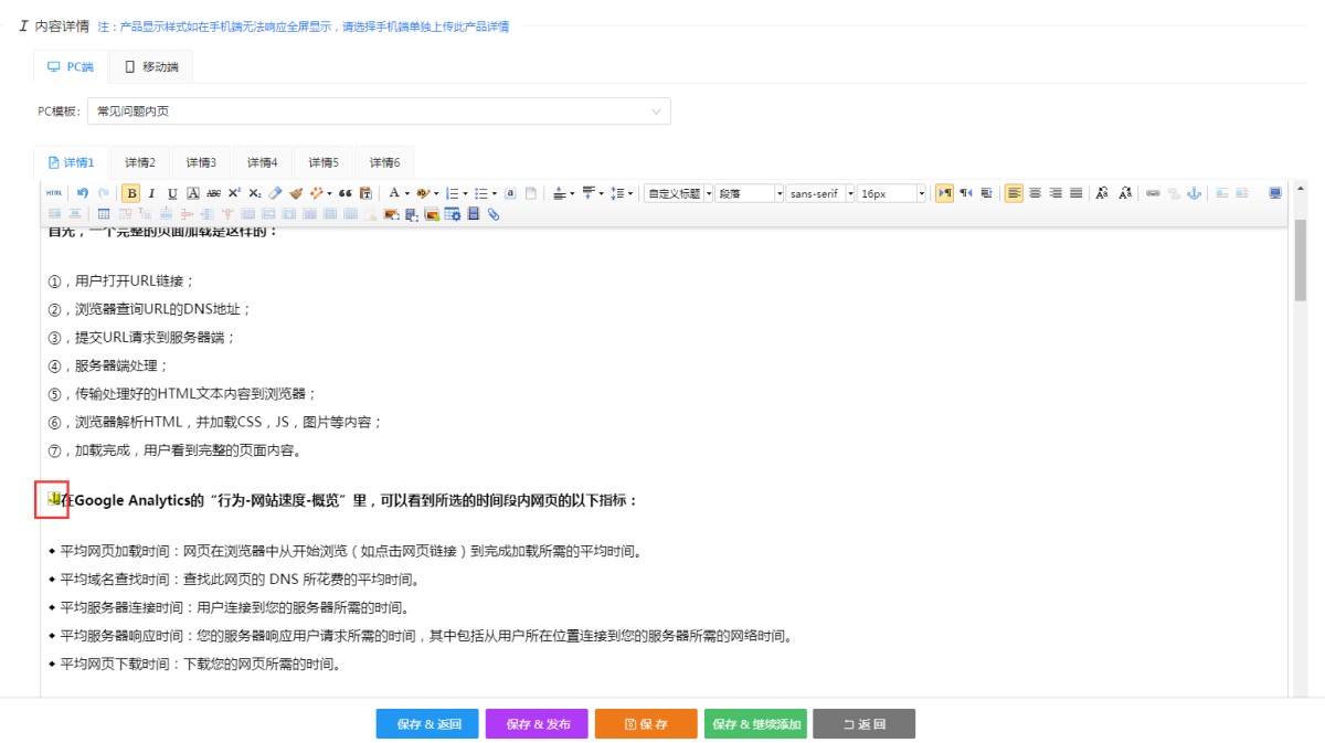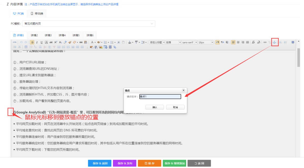 1,在CMS管理后台的产品详情编辑页面,在需要锚点定位的地方点击锚点功能,设置锚点名称,如锚点1。