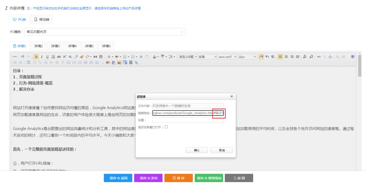 说明:产品详情里的锚点在设置时需要使用网站上线后的详情页具体链接,所以需要先给网站绑定域名上线。