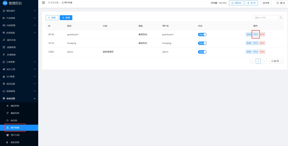 2,在管理后台-系统设置-用户列表里,找到客户的账号,点击密码,按照密码的规则要求进行重置即可。
