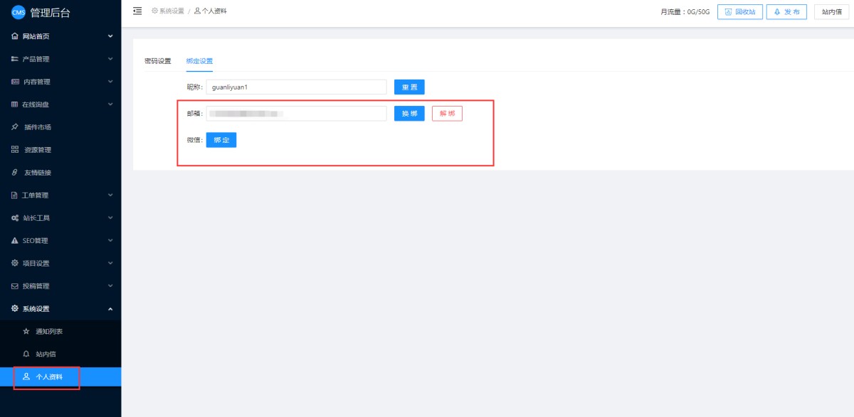 3,给客户重置密码后,建议让客户登录管理后台,在个人资料里绑定一下邮箱,以便后期使用。