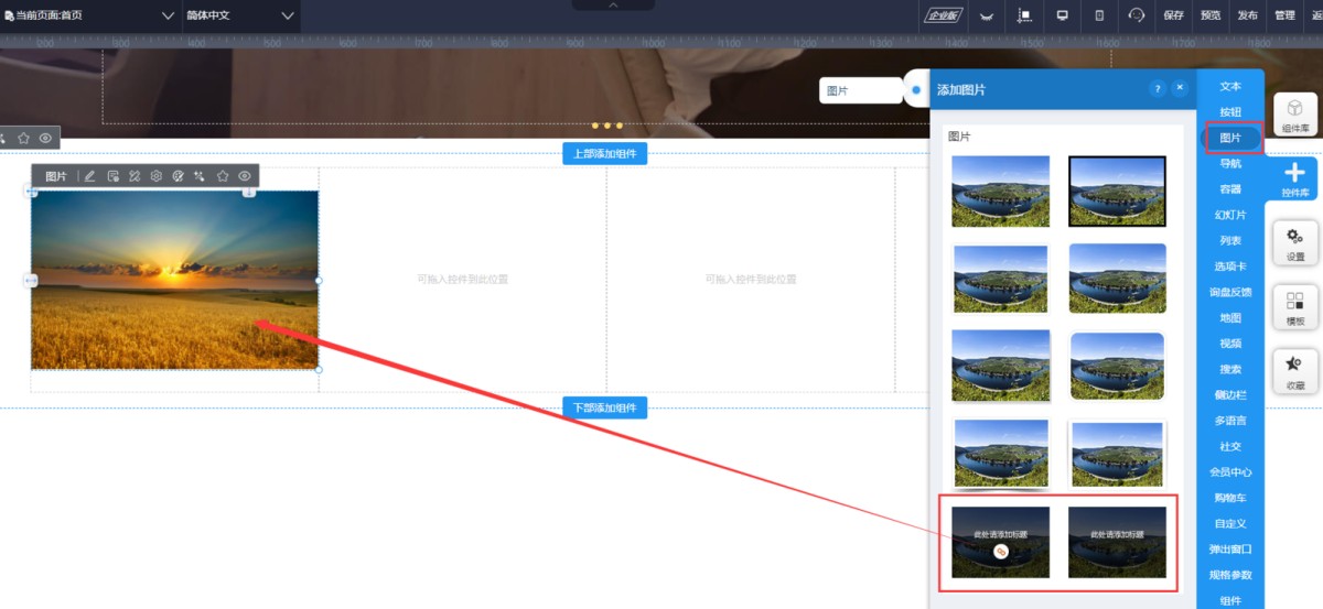 1,控件库-图片样式里,最后两个样式是带遮罩层的样式,其中一个带链接图标,一个不带链接图片,选中后拖拽添加到页面上。