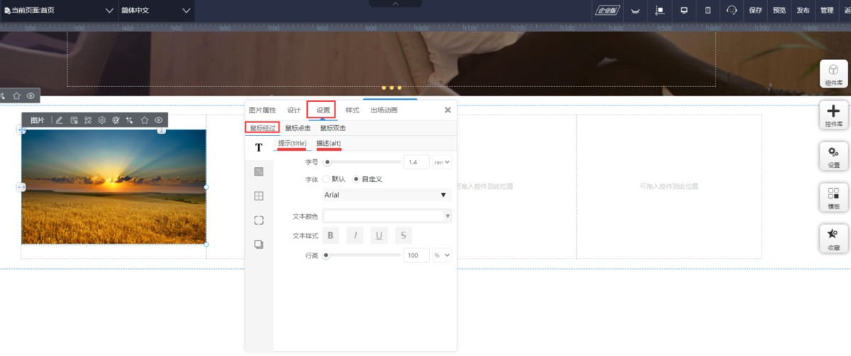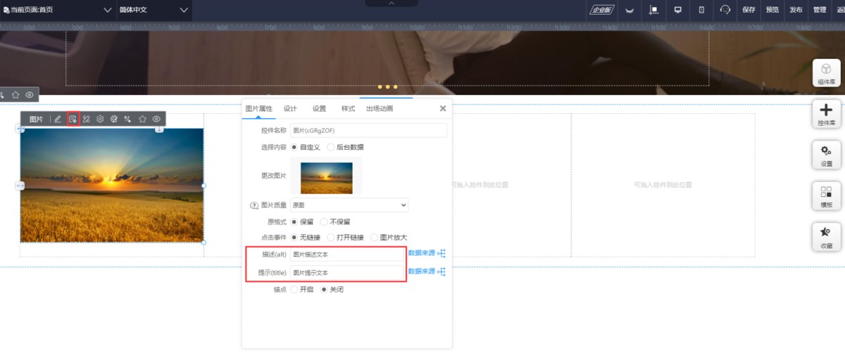 2,在图片属性里,有个描述和提示,设置好文本内容后,可以显示在遮罩层上。显示时提示文本在上,描述文本在下。