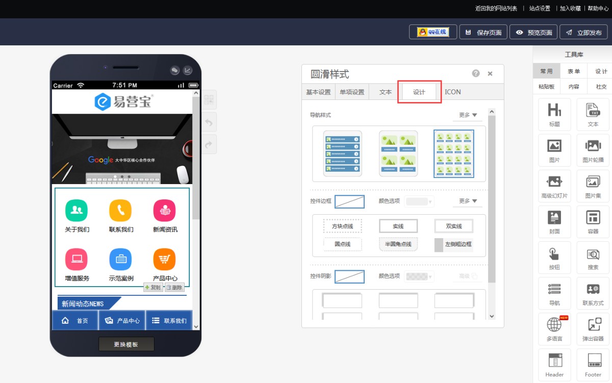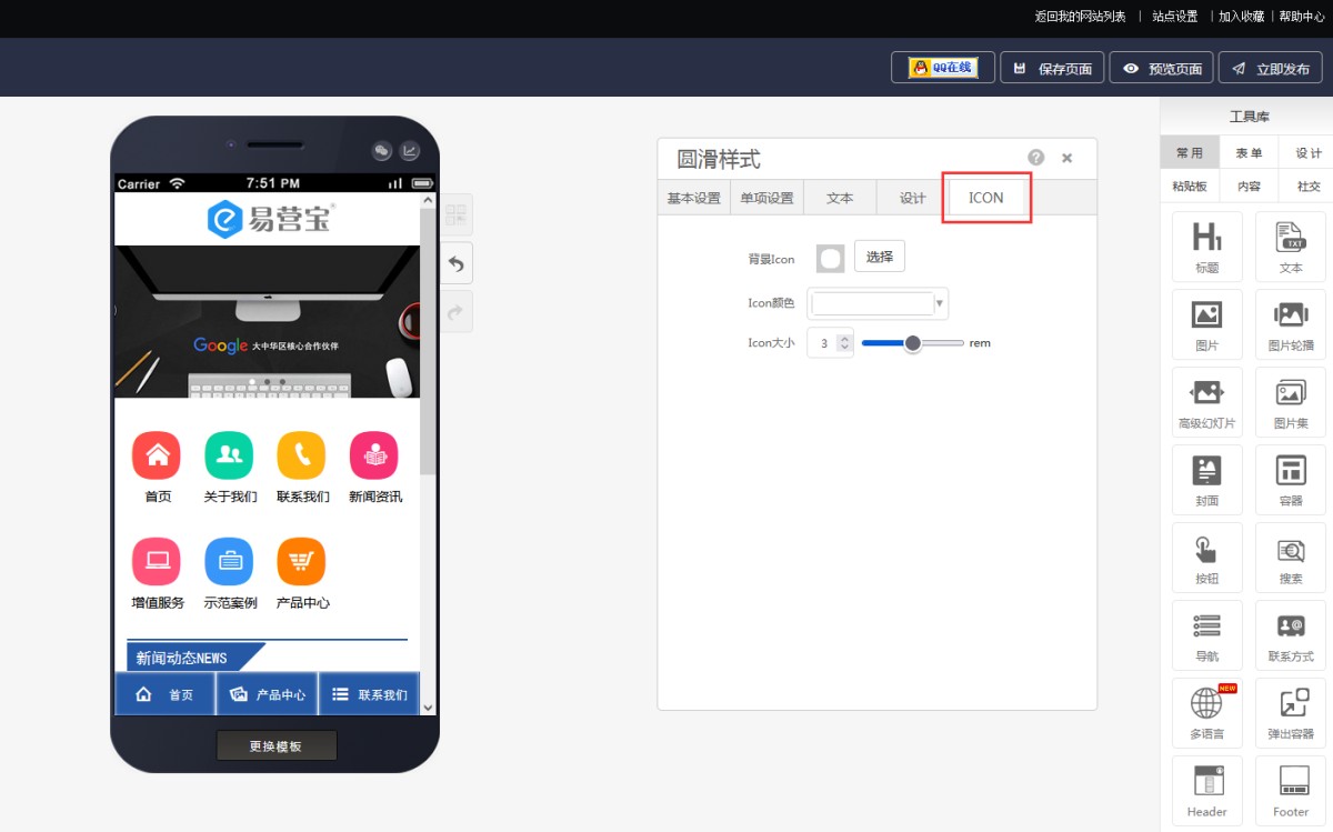 6,在ICON里,可以设置图标的颜色大小等样式。(说明:不同的导航样式,属性会有差别)