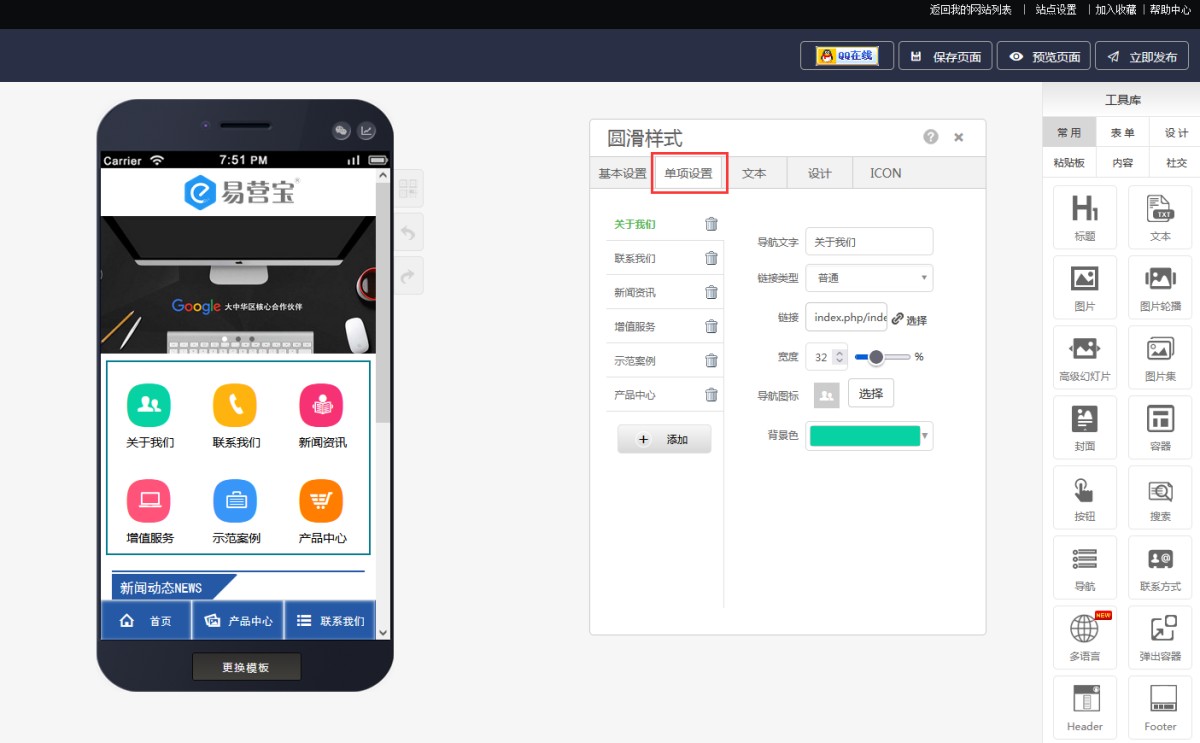 4,在单项设置里,可以对每个导航项进行修改,包含添加和删除导航项,编辑导航文字,设置导航链接,更换icon和颜色等。(说明:不同的导航样式,属性会有差别)