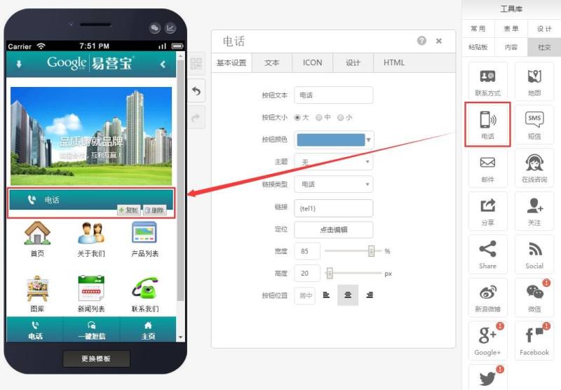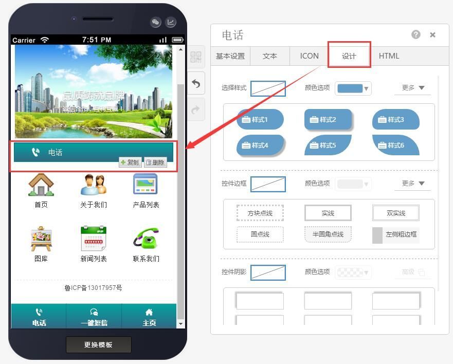 在页面中添加电话控件,有多种样式可选,还可自定义图标。