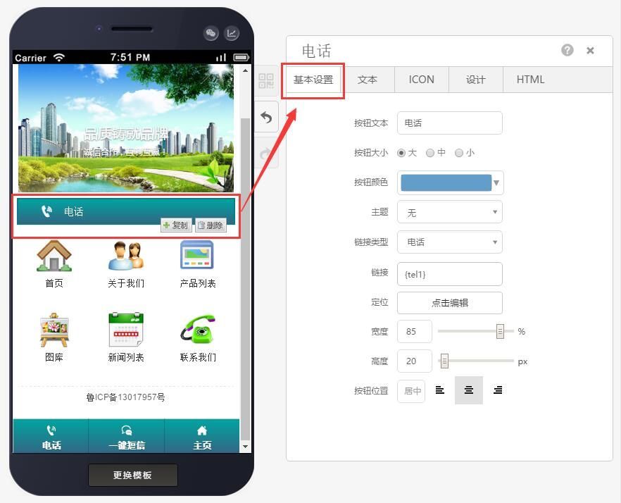 第三步:可自己在基本设置中设置按钮大小、背景色颜色、电话号码、高度/宽度、按钮位置等,如下图: