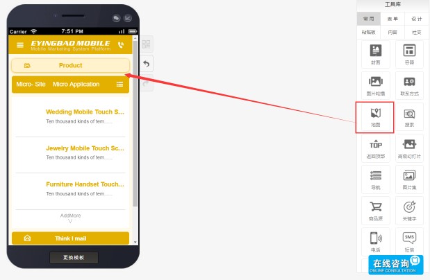 使用方法:在工具库找到“地图”控件,将其拖拽到编辑页面。