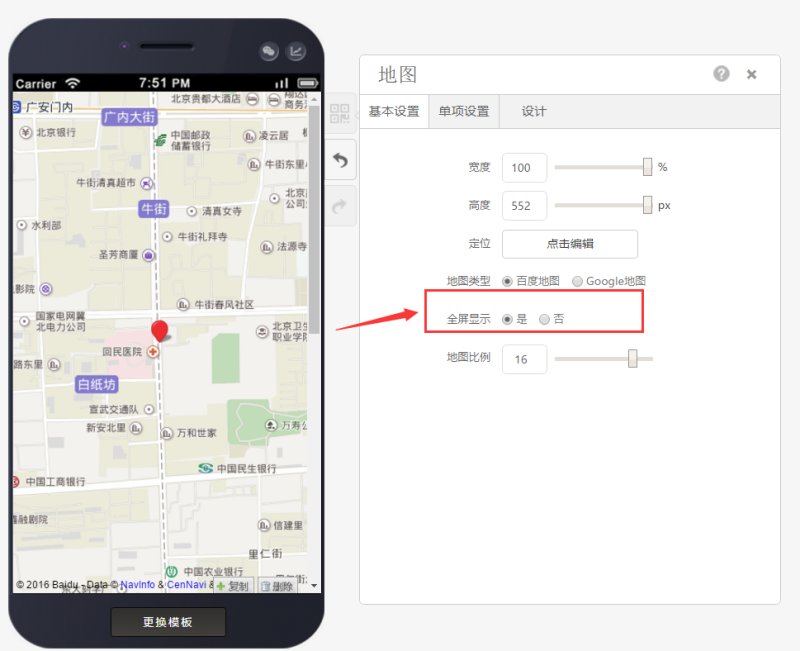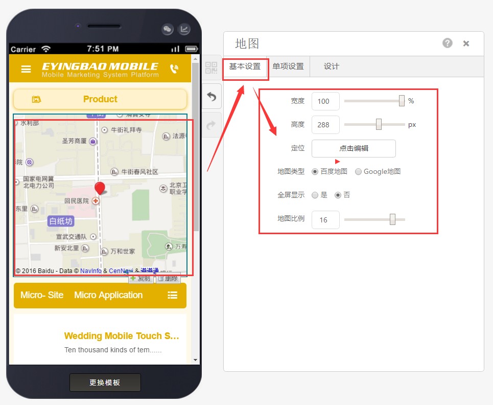可以在基本设置中选择地图的类型并对地图进行编辑。(因谷歌地图在国内不显示,所以网站上线后,需翻墙才能显示出谷歌地图)