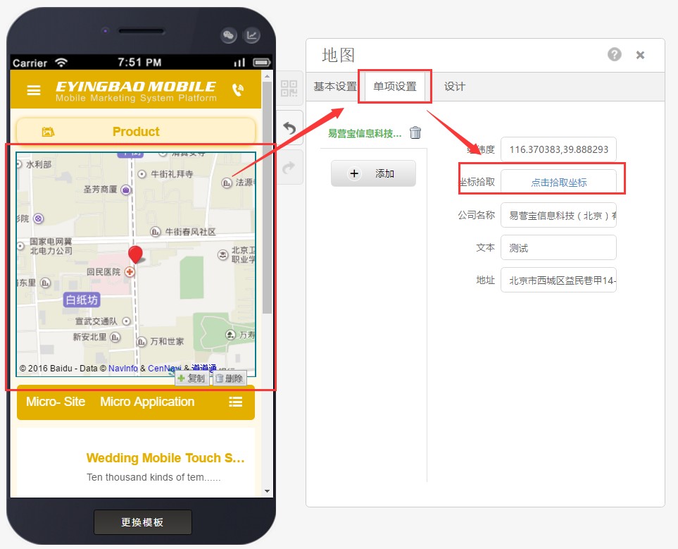 在单项设置中设置地址、电话、坐标等信息。想要获取准确地址需要“点击拾取坐标”。